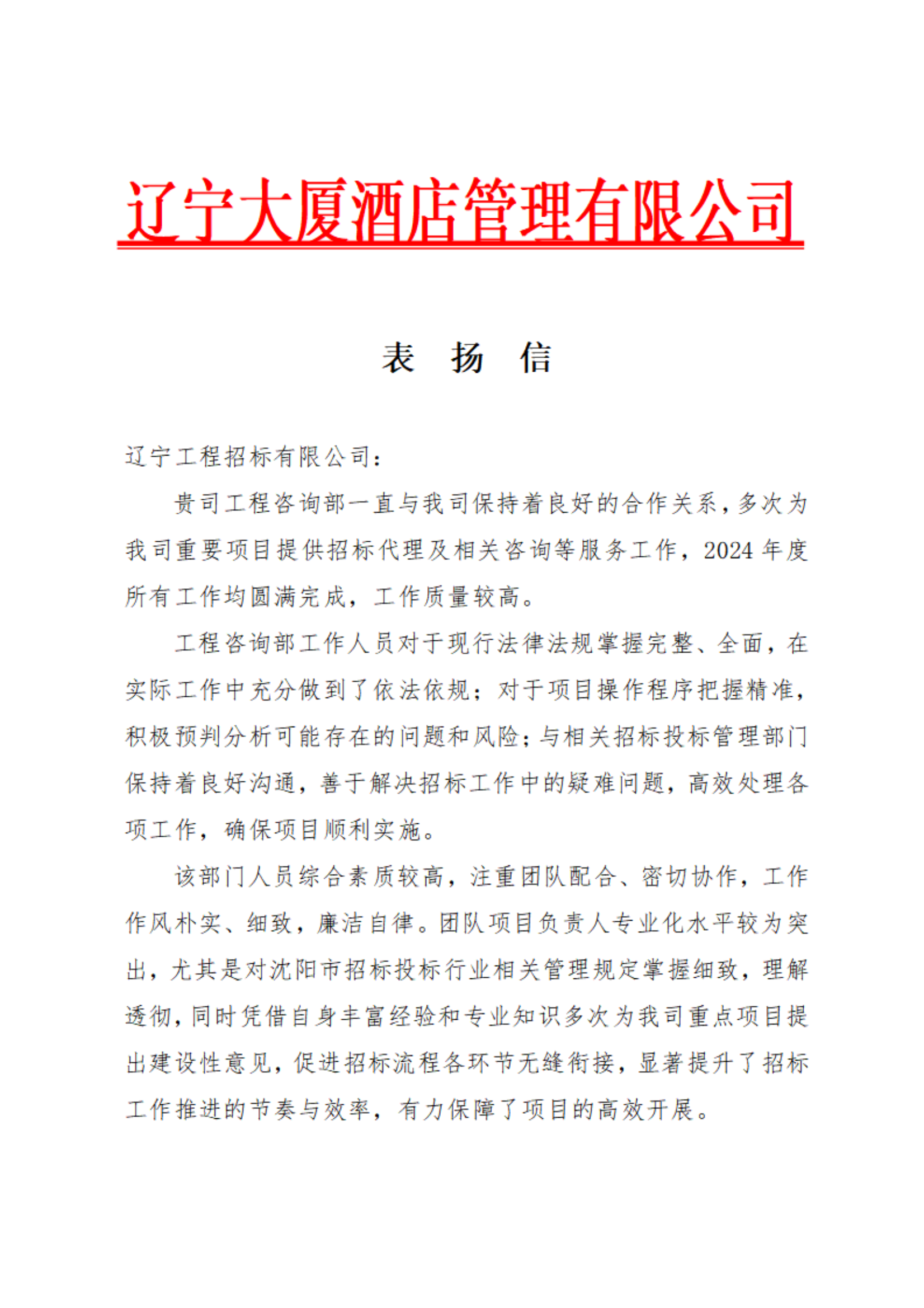 近日,公司收到辽宁大厦发来的表扬信,对公司业务团队在招标代理及相关咨询服务等工作中表现出的丰富经验和专业水平表示认可。